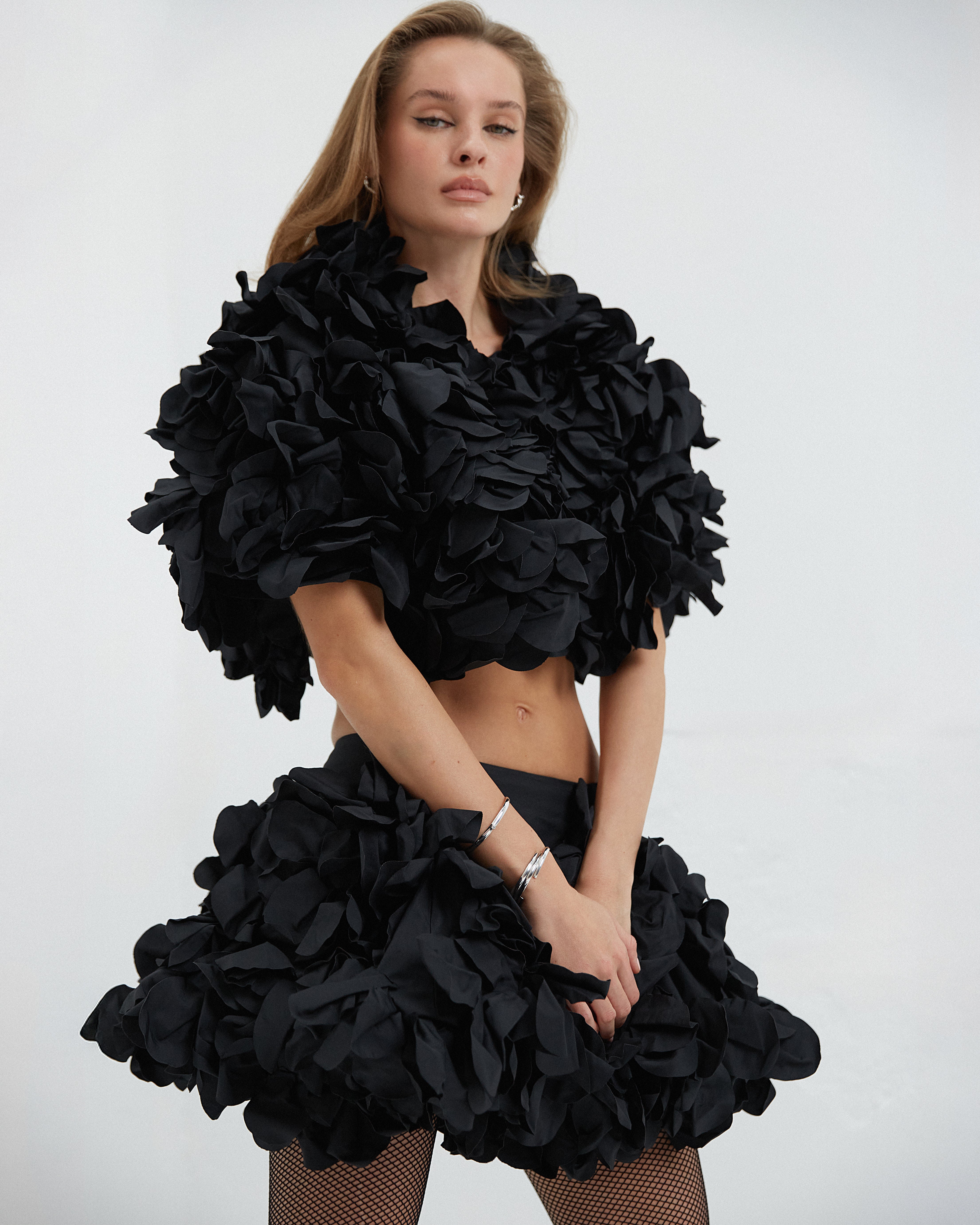 На ній болеро Monica з квітковими аплікаціями півоній. Обʼєм, що рухається разом із нею, і форма, яка мʼяко тримає акцент.