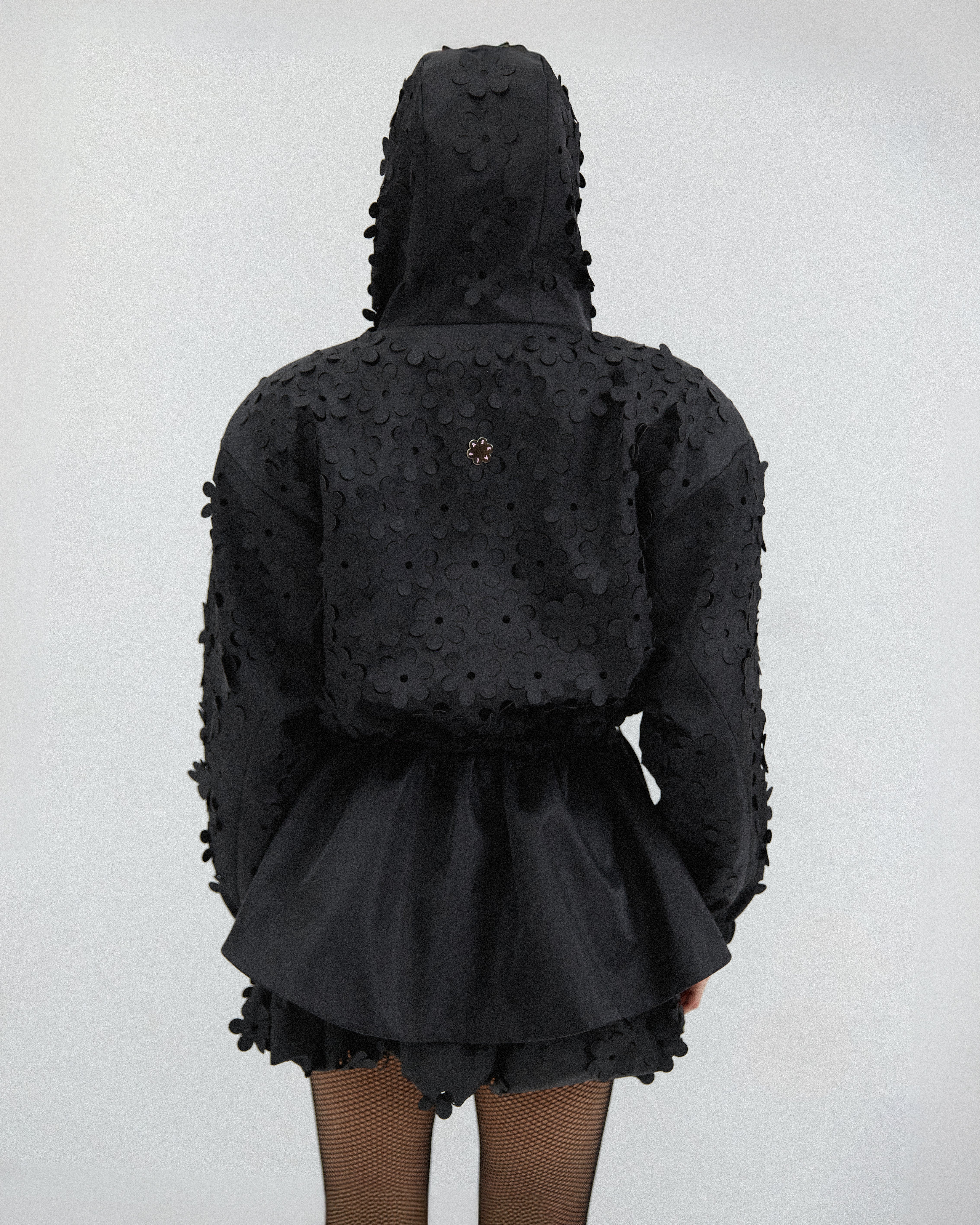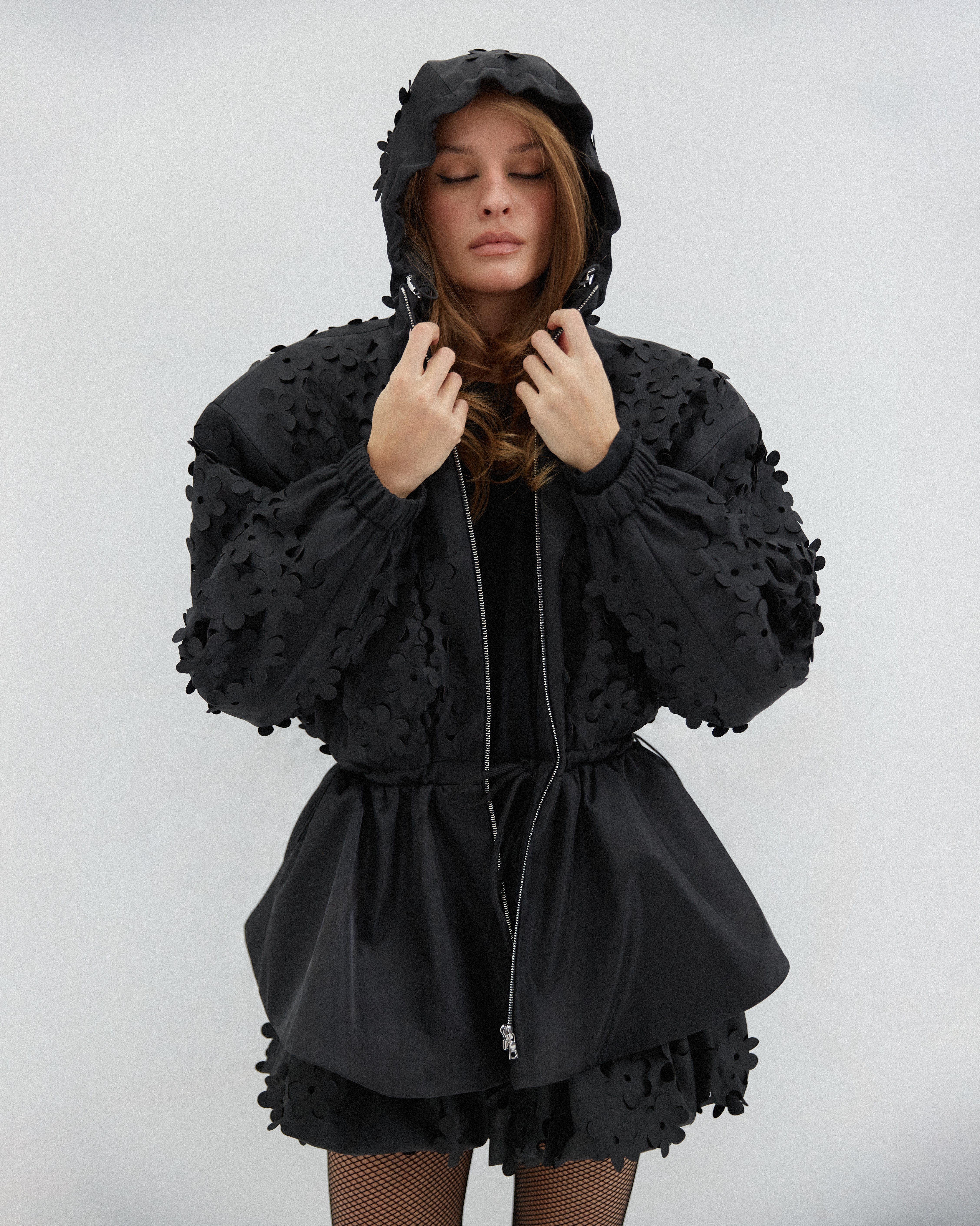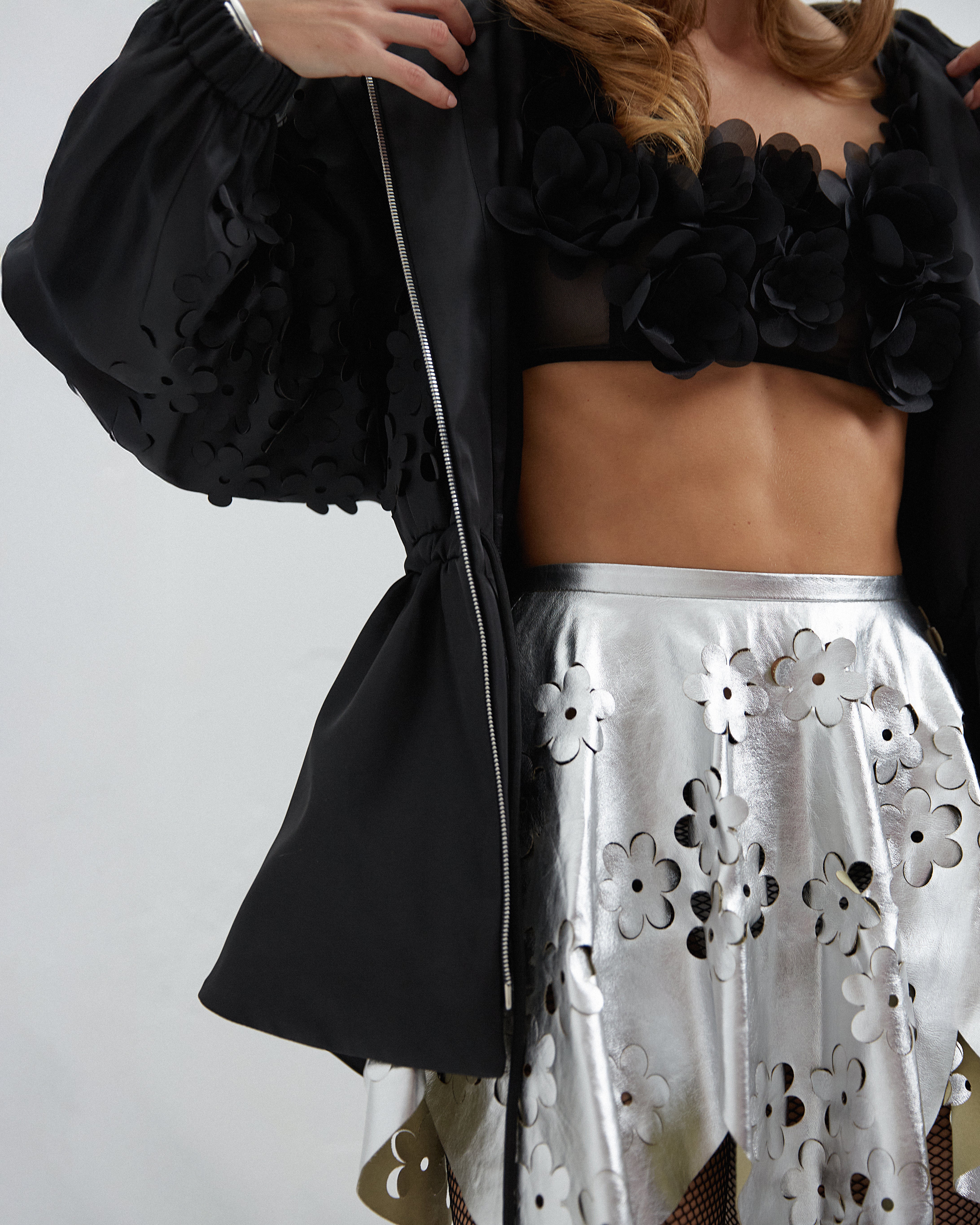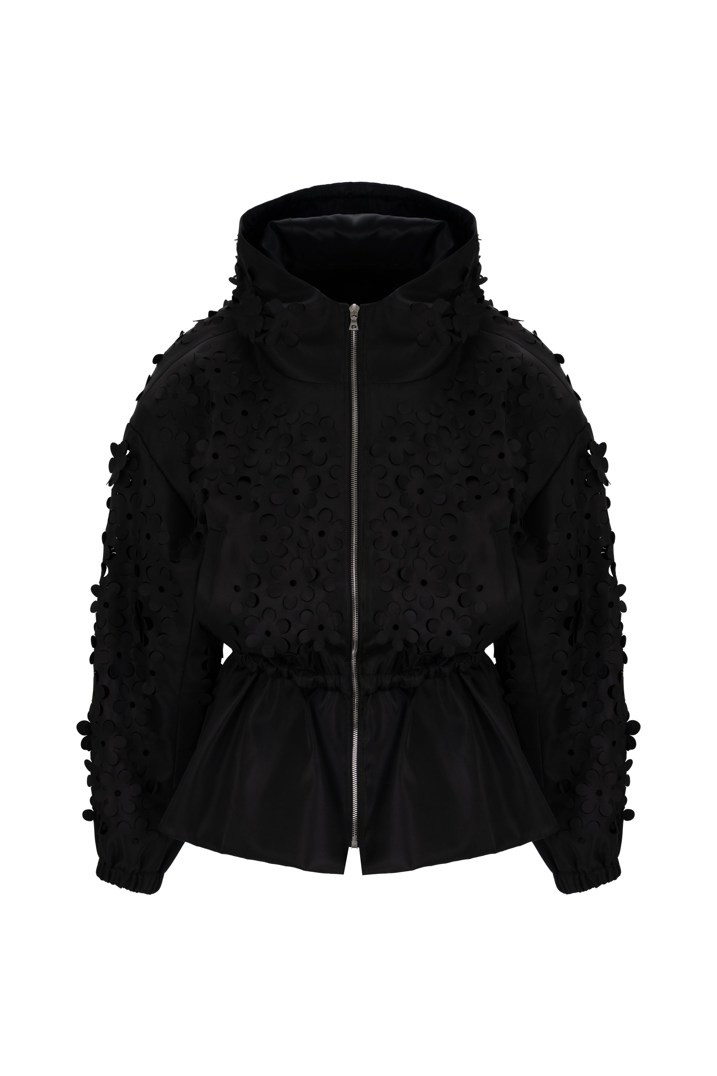 Куртка з декоративними квітковими вирізами по виробу. Регульована талія на затяжках формує силует з баскою. Повністю на підкладці для комфорту та збереження форми.