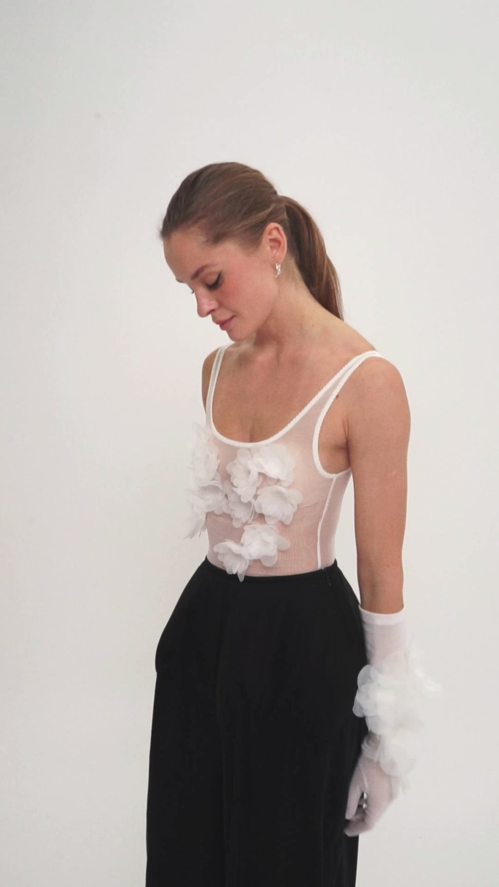 Боді з органзи оздоблене 3D квітами-півонії, що символізують красу жіночої природи. Пелюстки створюються в знаковій техніці laser cut та дбайливо фіксуються вручну, формуючи виріб із кутюрним характером. Боді PASKAL Peony додає легкості та ультрафемінності в образи для особливих подій, вечірок і моментів, коли просто хочеться квітнути.