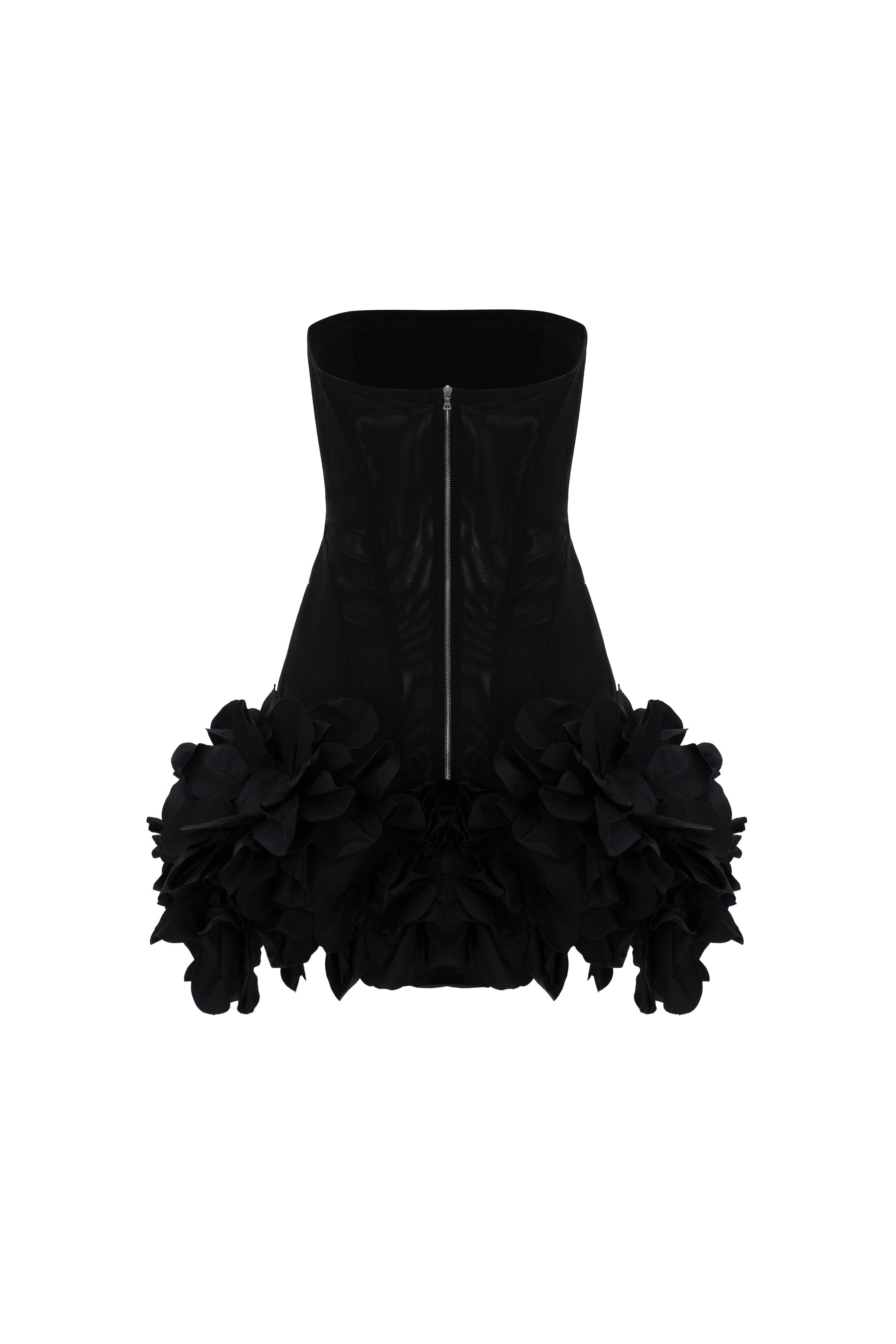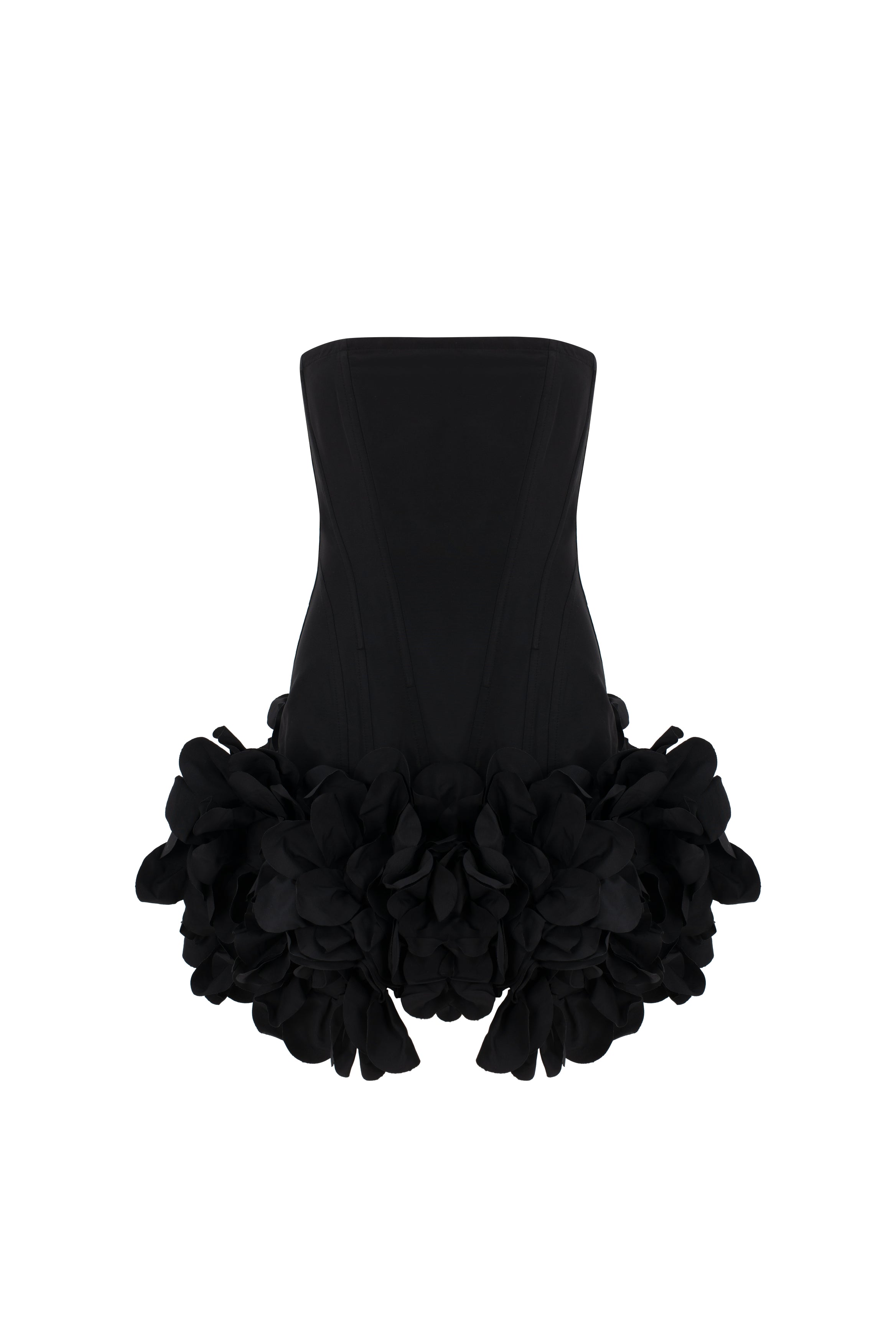 Міні-сукня з корсетною конструкцією та обʼємним квітковим оздобленням.