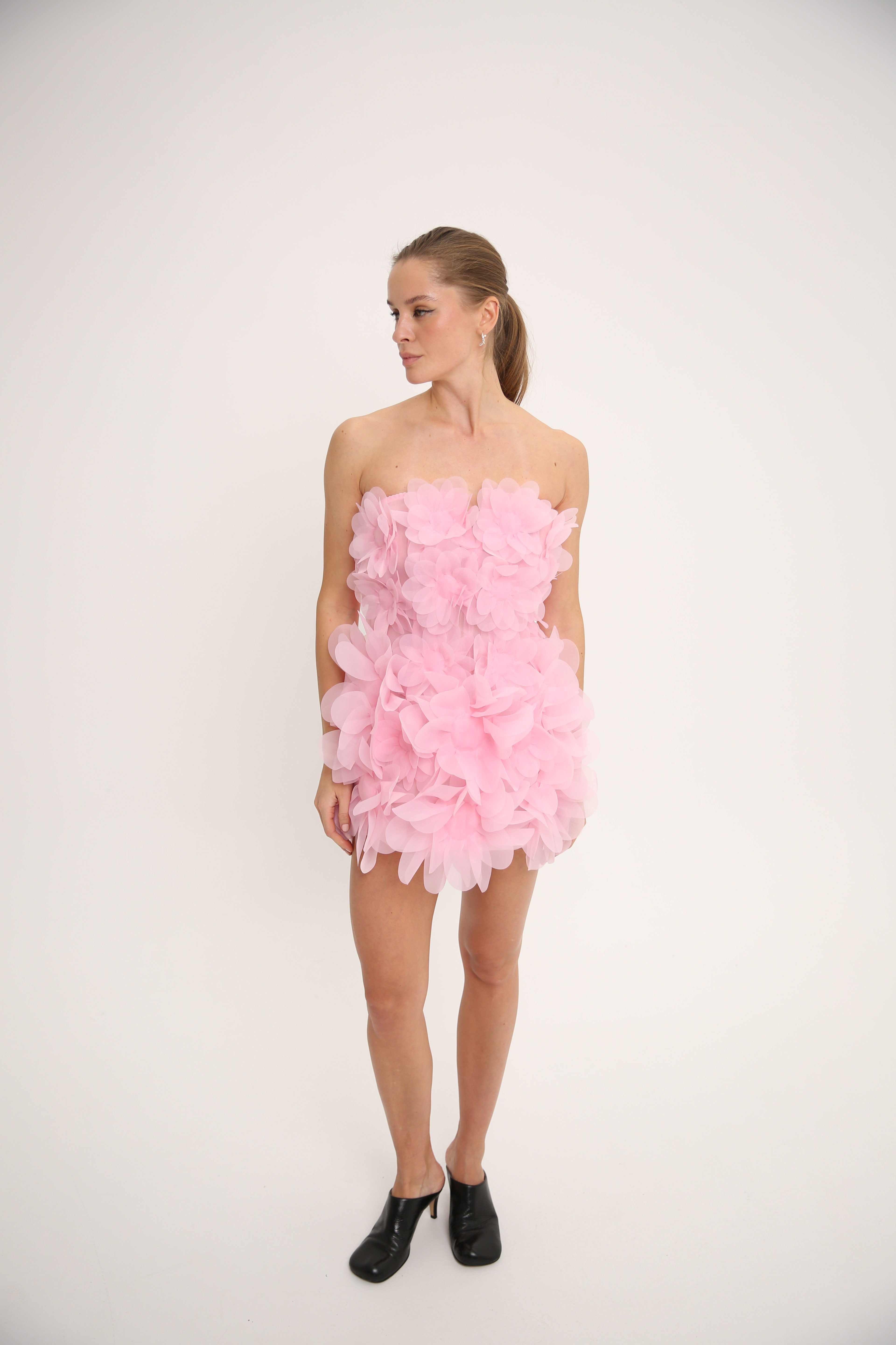 An organza mini dress is embellished with 3D peony flowers that reveal the beauty of feminine nature. 360 petals are crafted using PASKAL’s signature laser-cut technique and carefully arranged by hand, shaping a piece with a couture character. The PASKAL Peony dress brings softness and ultra-femininity to outfits for special occasions, parties, or those moments when you simply feel like blooming.