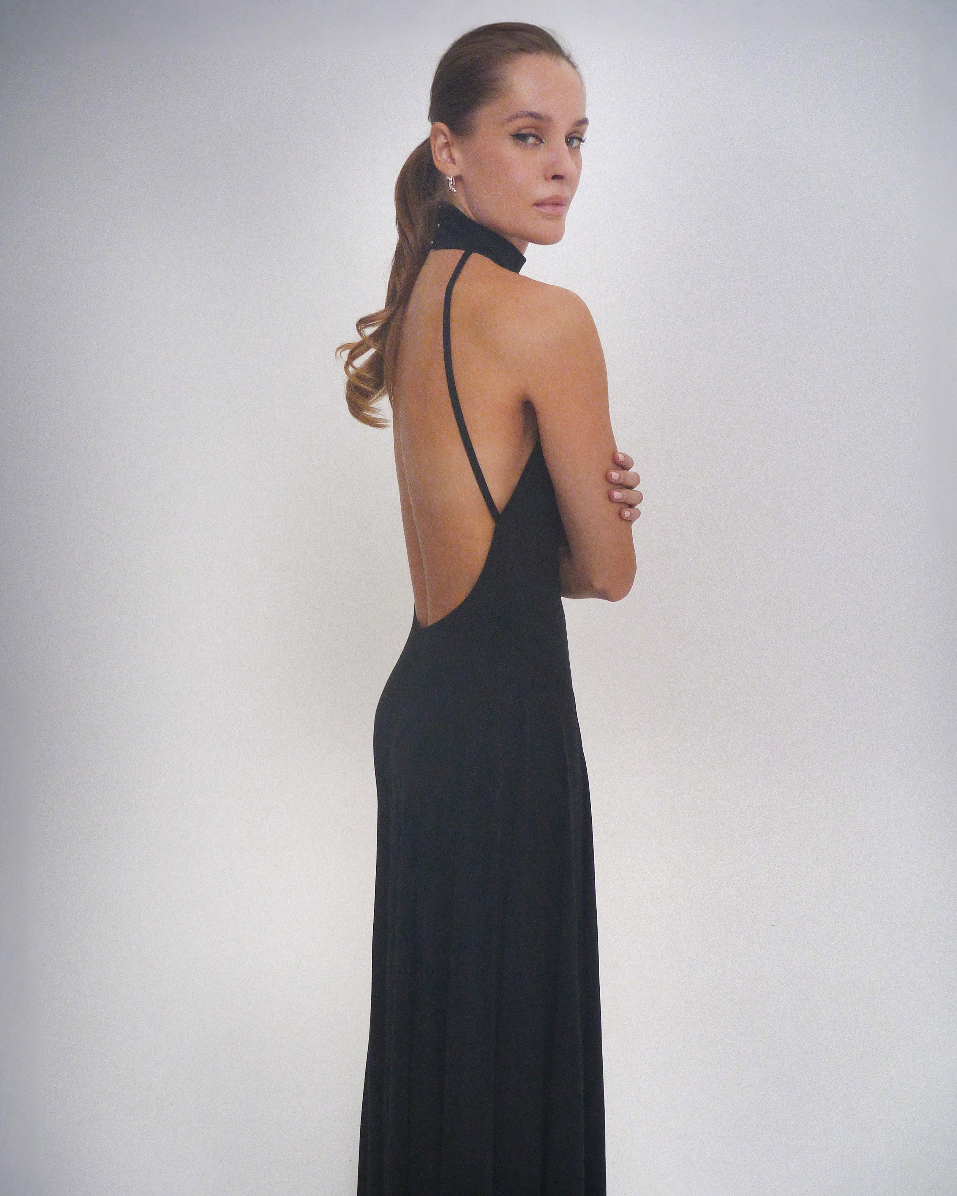 Crafted from the finest Italian knitwear, it features a voluminous skirt, an open back, and a sculptural silhouette that highlights the waist and contours of the body.