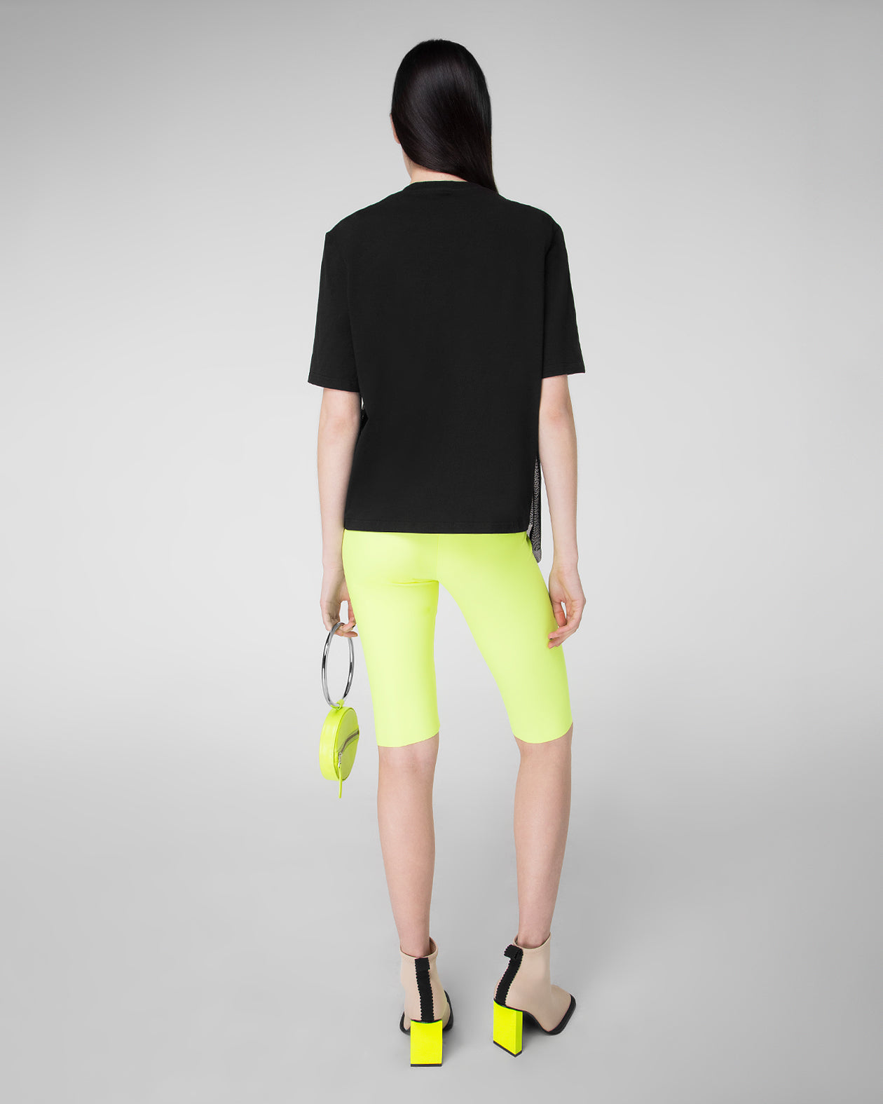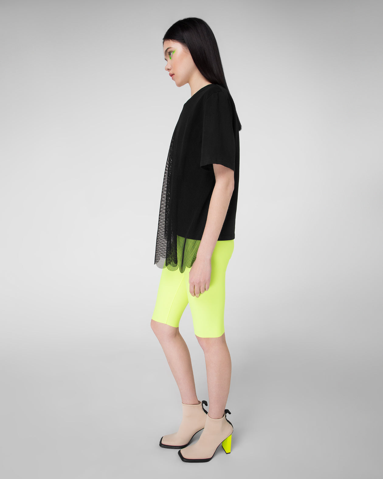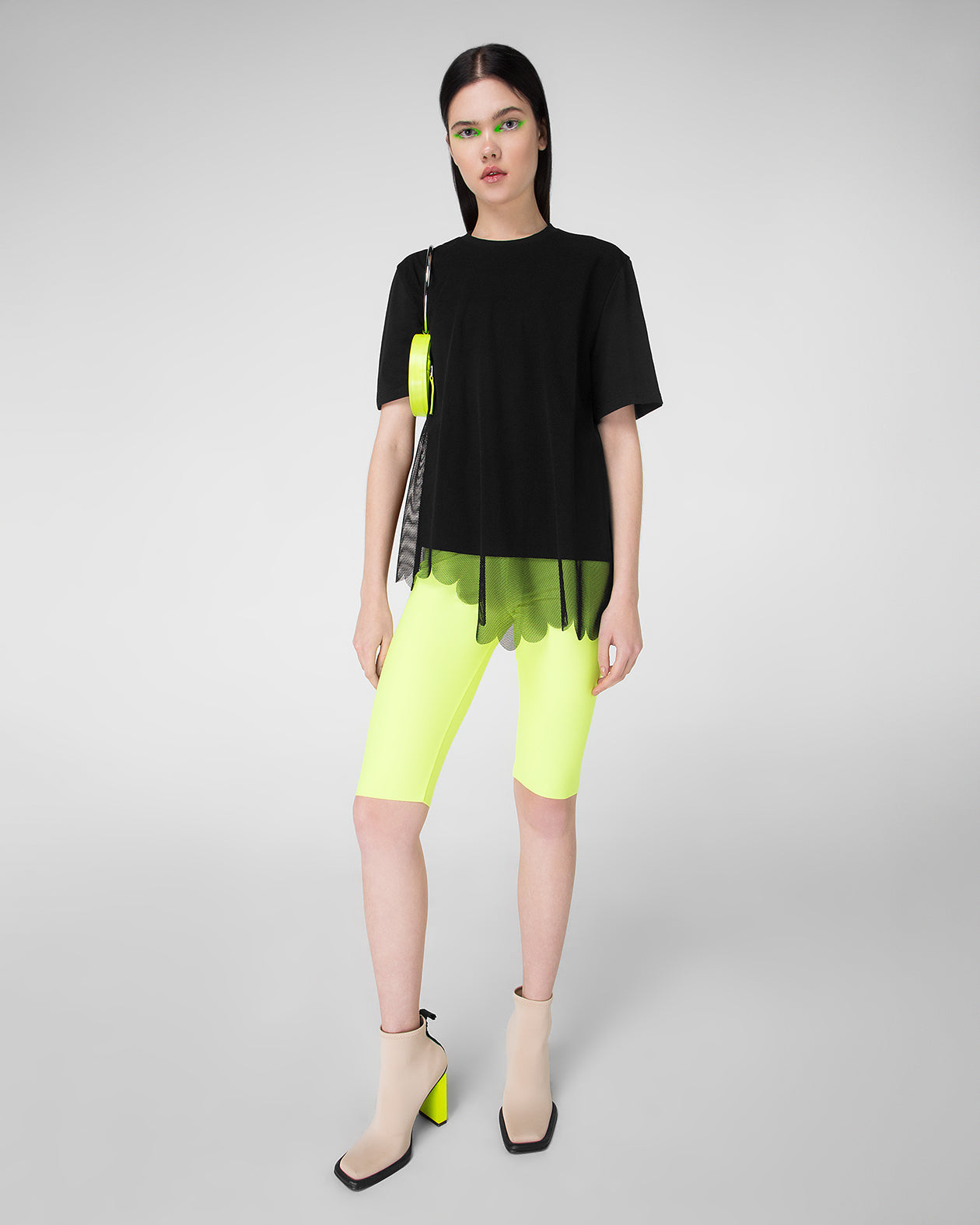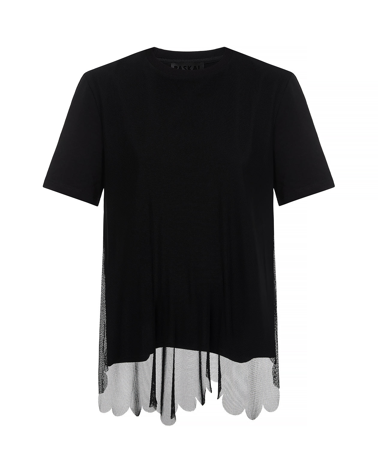 Paskal’s black T-shirt with Scalloped Mesh detail gives off notes of elevated simplicity, as well as the way every design under the brand’s name has the possibility to be heightened through the use of laser-cutting. The scalloped hem of the t-shirt created out of mesh lightly falls at the hips, and is able to be paired with denim or a straight-legged pant.