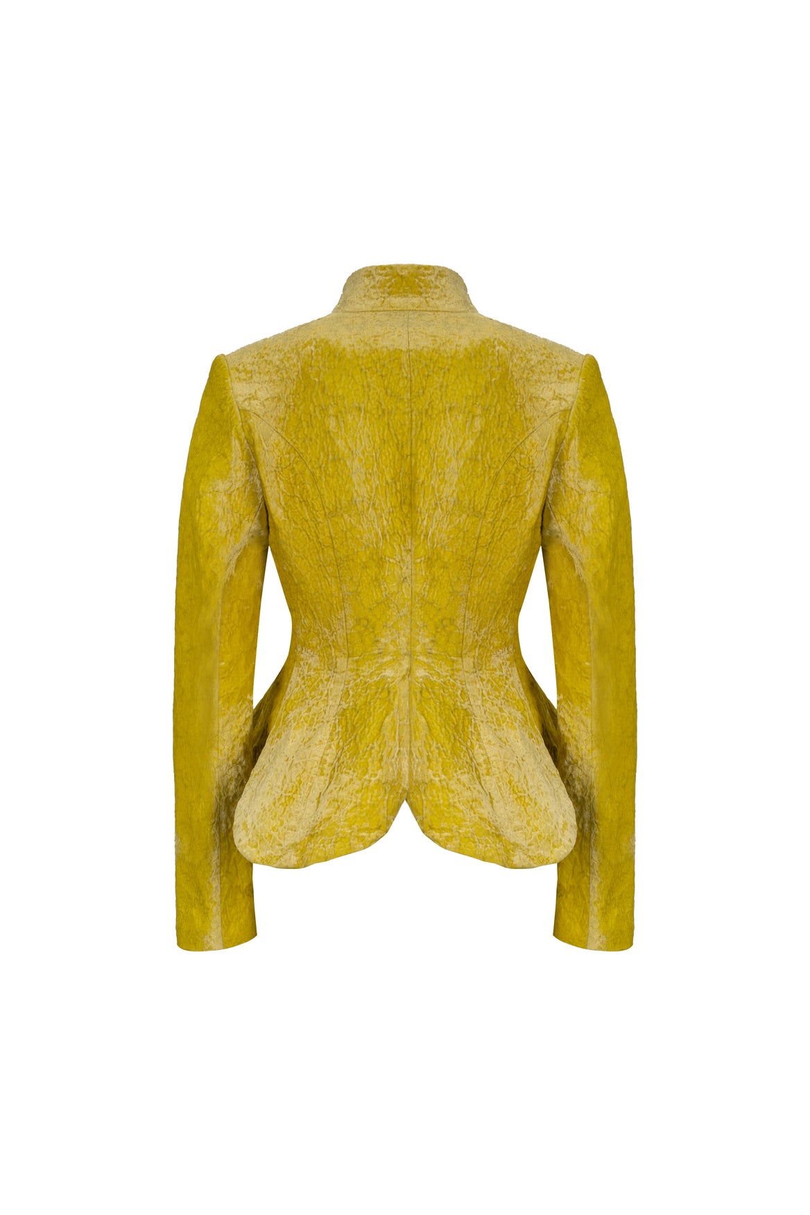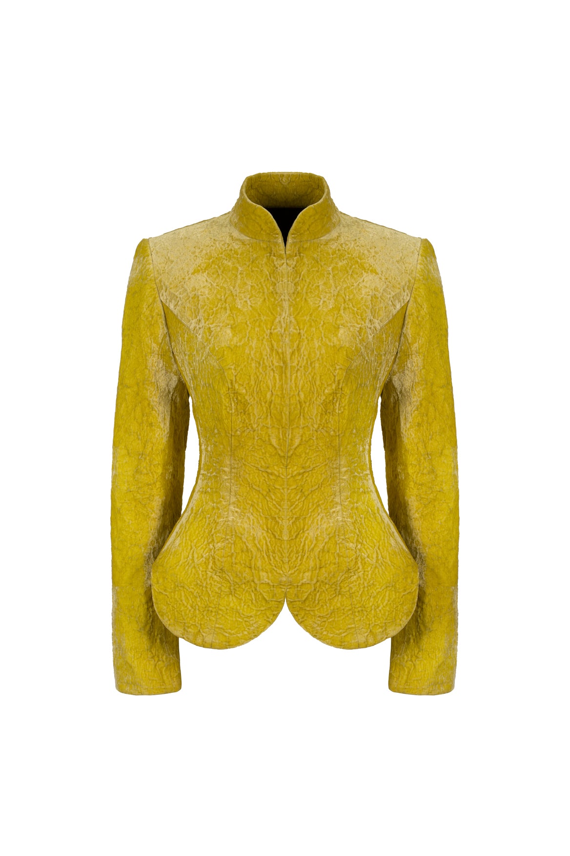 Оксамитовий жакет з виразною формою, у якій головну роль відіграє силует. Квітково натхненні лінії, овальний низ і мʼяко підкреслені плечі доповнені металізованою memory-підкладкою. Кількість лімітована.
